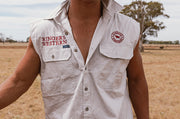 Crafted from 100% premium cotton, our sleeveless workshirts are lightweight and tough, double chest pockets, and Ringers Western signature branding. The cut-off sleeve design keeps you cool in the heat and gives you complete range of motion for physically demanding days.
