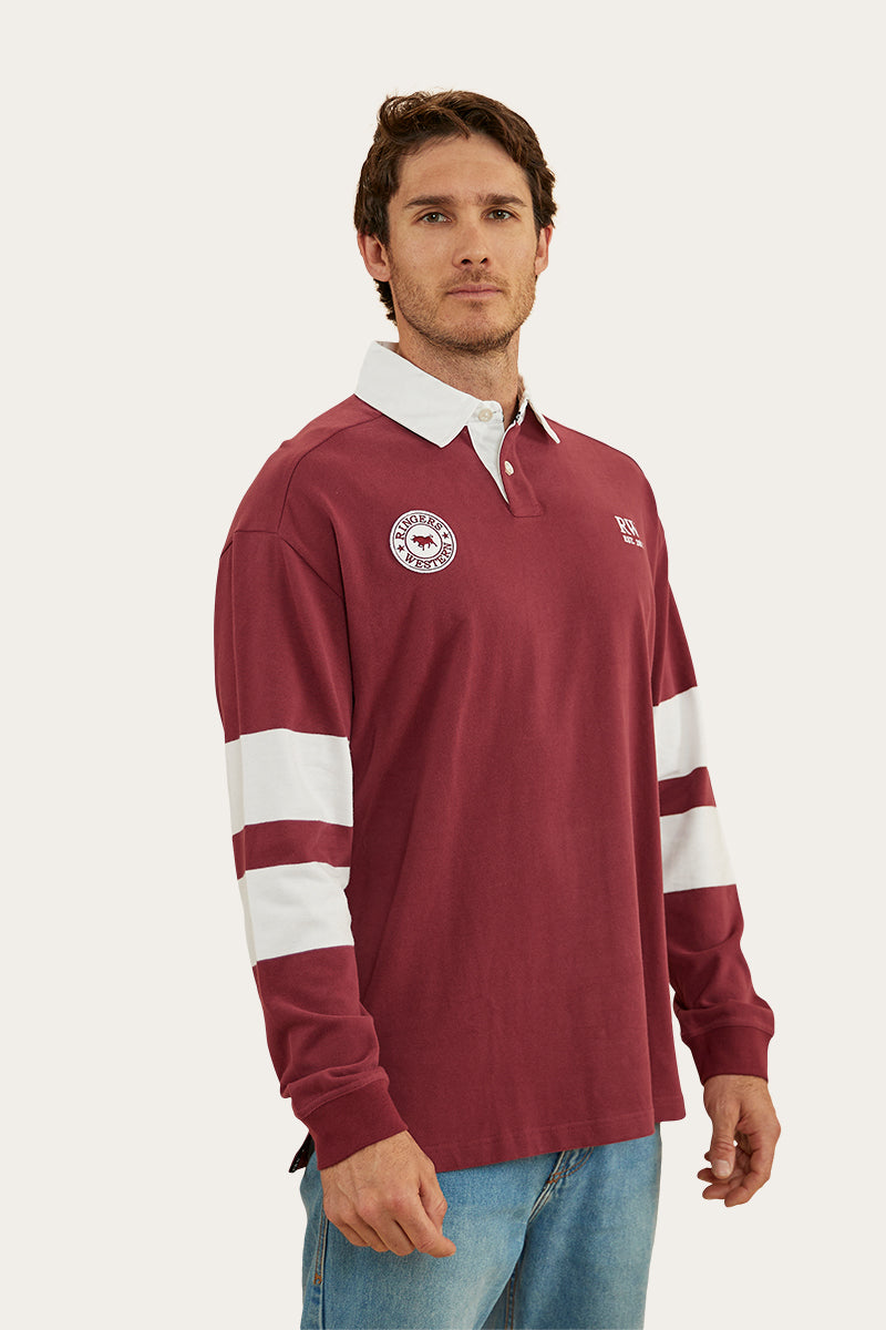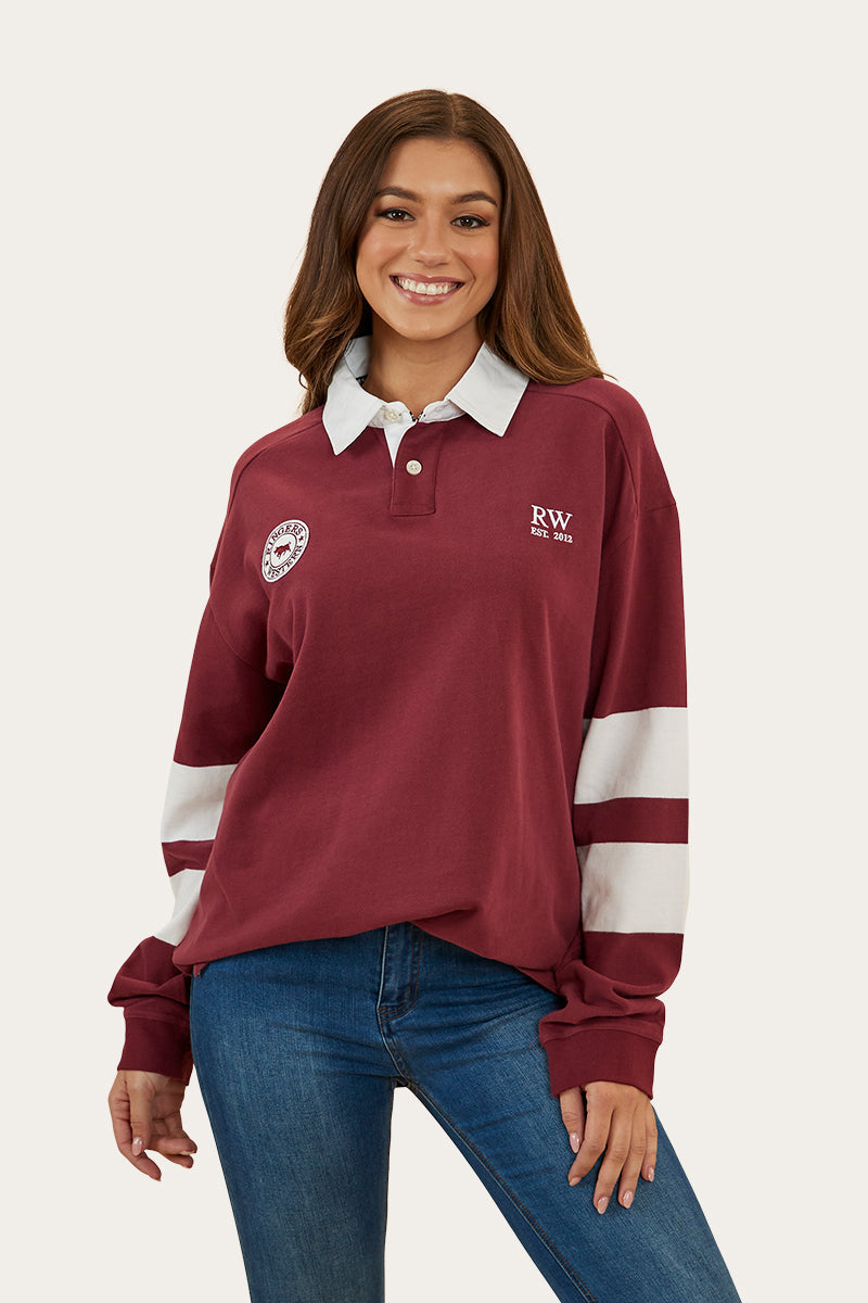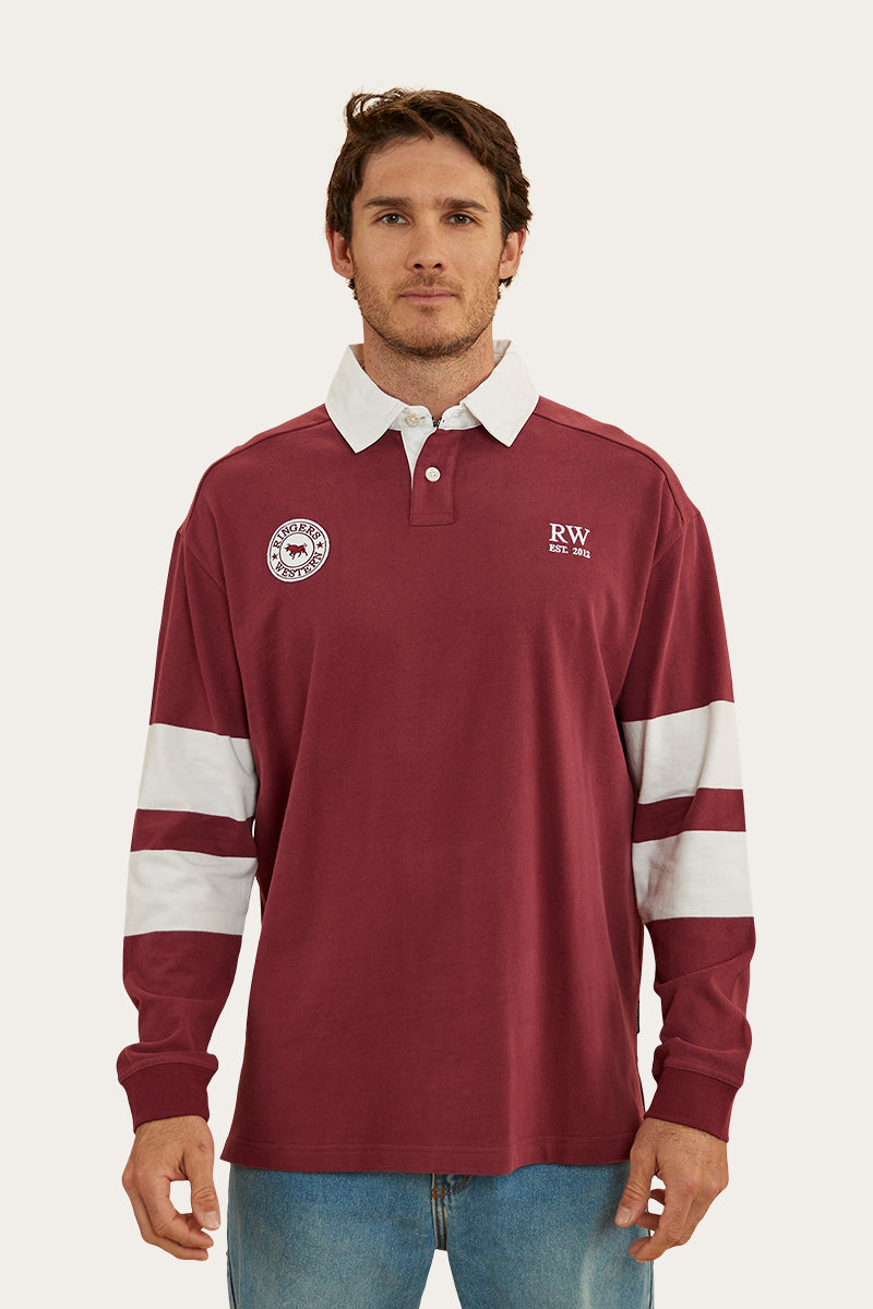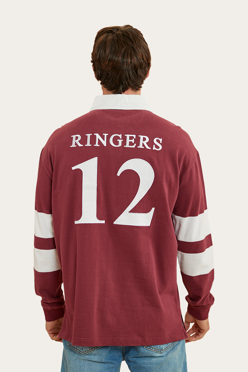 The Rivalry Rugby Jersey is the perfect way to support your team in the Origin. Crafted from 100% Cotton rugby knit, this jersey is built to withstand the toughest of matches while providing all day comfort and warmth. Designed for versatility, the unisex style and loose fit ensure a relaxed yet flattering silhouette for both men and women. The dropped shoulder adds a relaxed feel whilst ensuring freedom of movement. Complete with Ringers Western woven labels, this jersey is a true symbol of our dedication to authentic Western style and superior quality. Whether you're on the field or cheering from the sidelines, the Rivalry is sure to make a statement wherever your adventures take you.