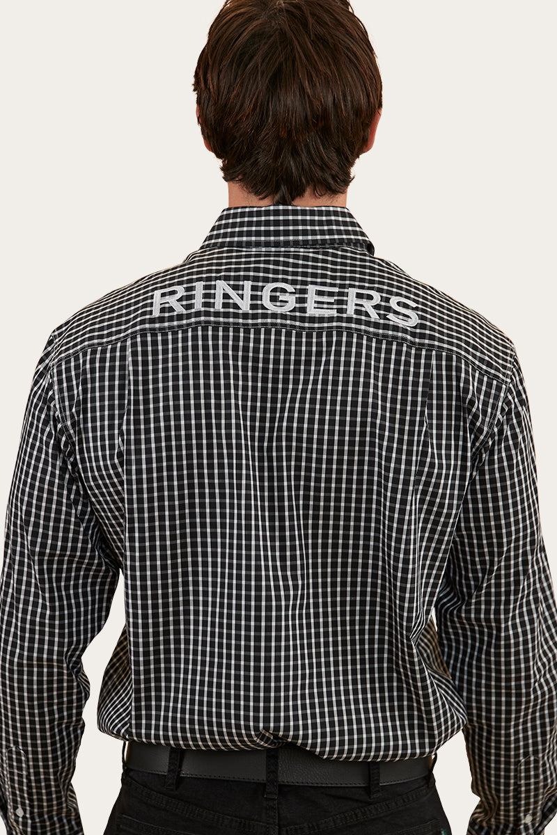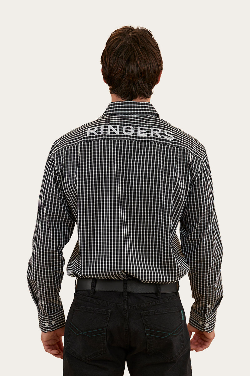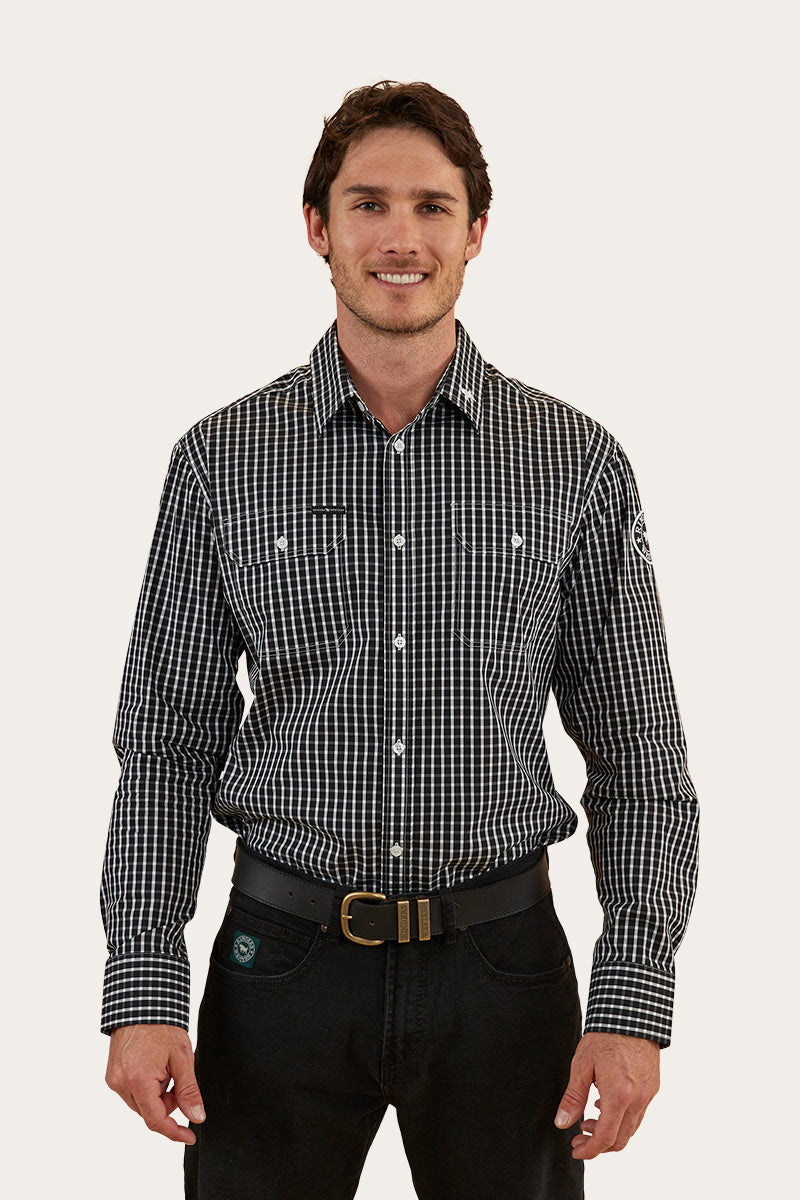 Shelton is the perfect PBR number. This semi-fitting dress shirt is the perfect blend of tradition and modern western wear. Our Ringers Western semi-fit dress shirts closely follow the natural shape of your body without feeling too snug or restrictive. Crafted from a premium blend of cotton, nylon, and a hint of spandex, this shirt offers a luxurious feel with a touch of stretch for unmatched comfort and mobility. The Shelton features multiple embroidered logos on the collar, wearers left arm and centre back yoke while the double chest pockets add both style and utility to your outfit. This dress shirt has our 'Cowboy' length which ensures you will never be left untucked - a tried and true staple.