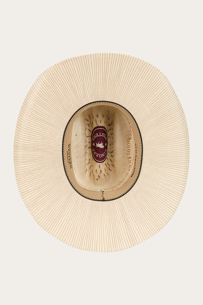 Built for long days under the sun, this summer cowboy hat features a classic cattleman crown that sits comfortably and securely on the head, while the Dri-Lux sweatband actively absorbs moisture to keep you cool, dry, and comfortable, even on the hottest days. A striking contrast weave adds texture and visual appeal, complemented by a Montana-style studded hat band and finished with an antique brass Ringers Western pin — a refined detail that brings style to its rugged functionality.