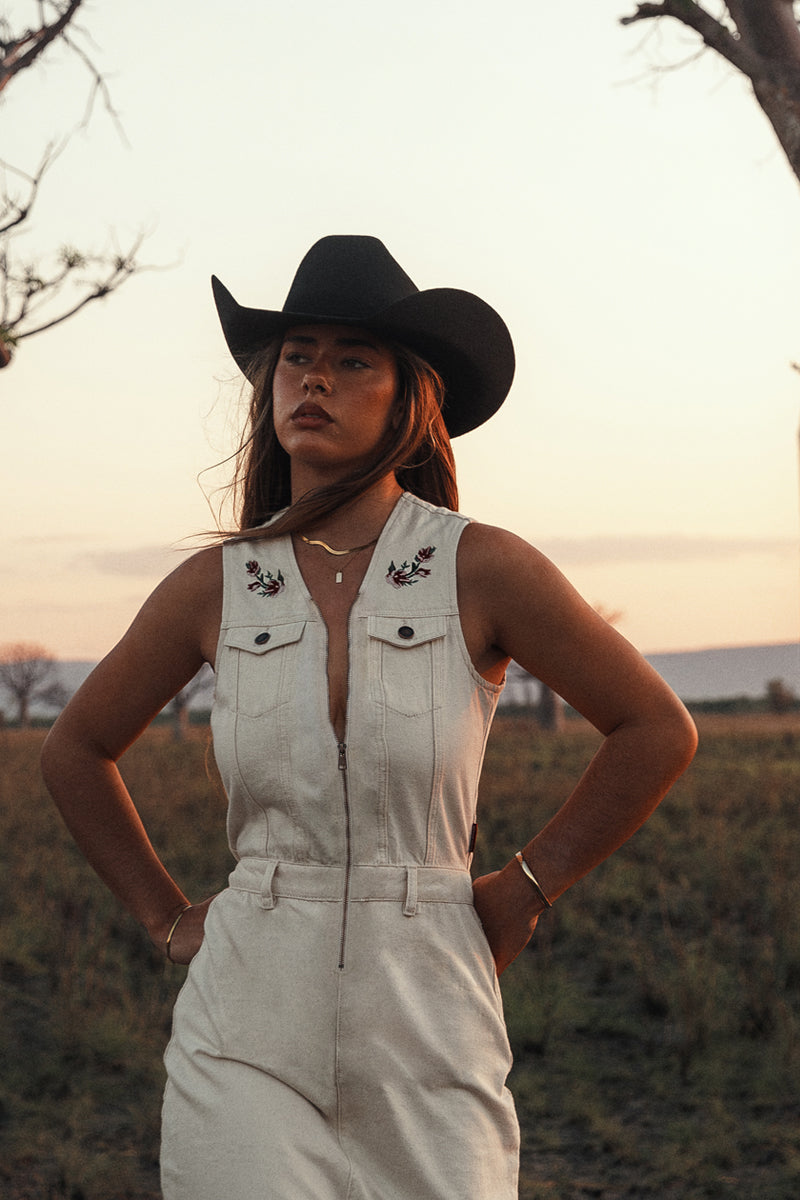 Crafted from 100% cotton denim, the Airlie Women's Denim Dress will keep you comfortable whilst looking on point. The denim used in this design has a more rigid feel than stretch denim, enabling the Airlie to hold its shape whilst allowing your body to breath - a must during the Aussie summer. Designed in a midi-length, this dress features a front hem split, allowing you to move freely in style. The Airlie dress features a convenient front zip closure, a secure and easy wearing garment that will keep you in good stead for all occasions. Standard belt loops allow you to style the Airlie with your favourite belt, highlighting your waist whilst accessorising with your own personal flair. Signature floral embroideries and western inspired style stitching are stand out features, harmoniously complemented by feature panel seams making the Airlie Denim Dress the perfect embodiment of country charm and elegance.