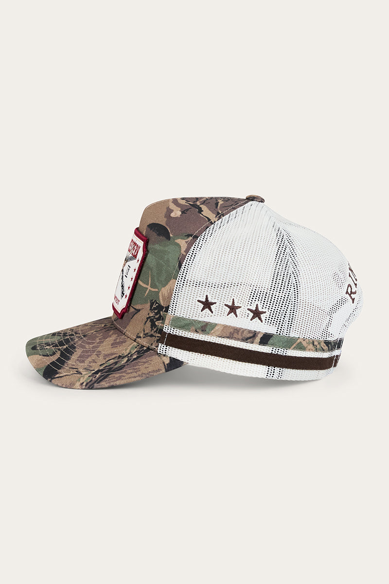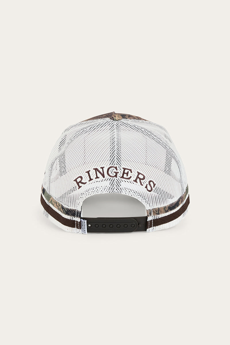 Crafted from a tree print camo fabric, the Big Buck lets you blend into the surrounds for all the right reasons. A curved peak shades eyes from the sun, whilst premium mesh back panels provide optimal ventilation. The deep fitting design features a snapback closure, allowing for a comfortable and customisable fit. A detailed signature woven buck badge and twill side stripes finish this cap off in rugged Ringers style.