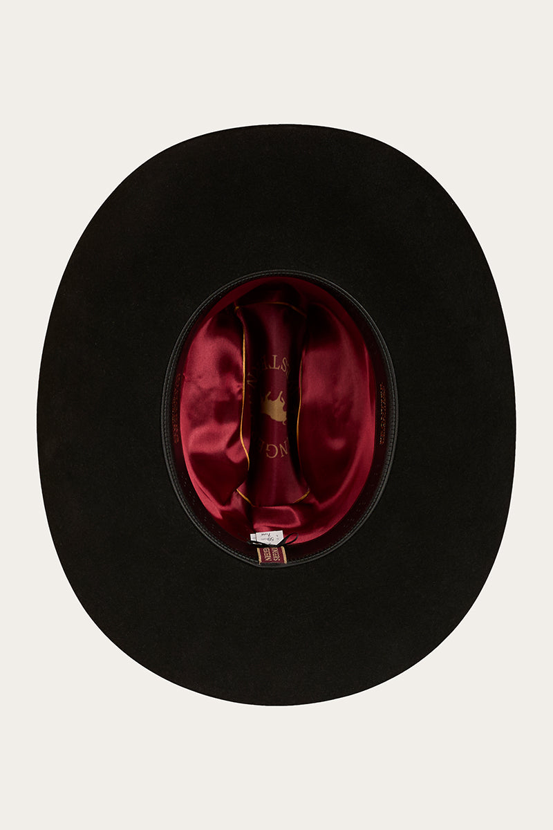 Featuring burgundy satin lining, a leather sweatband, and crown perforations for ventilation, the Frontier is as comfortable as it is stylish. With a Cattleman crown and a pre-shaped brim, this black cowboy hat offers a classic silhouette, and the self-felt band with buckle trim adds a refined finish. Available in timeless shades of Woodsmoke and Black, it also includes a Ringers Western custom hat brush to help you maintain its impeccable appearance. For those seeking cowboy hats that embody quality, functionality, and timeless style, the Frontier is the ultimate choice.