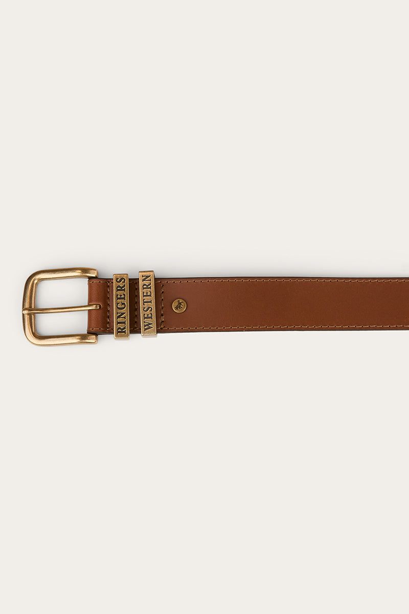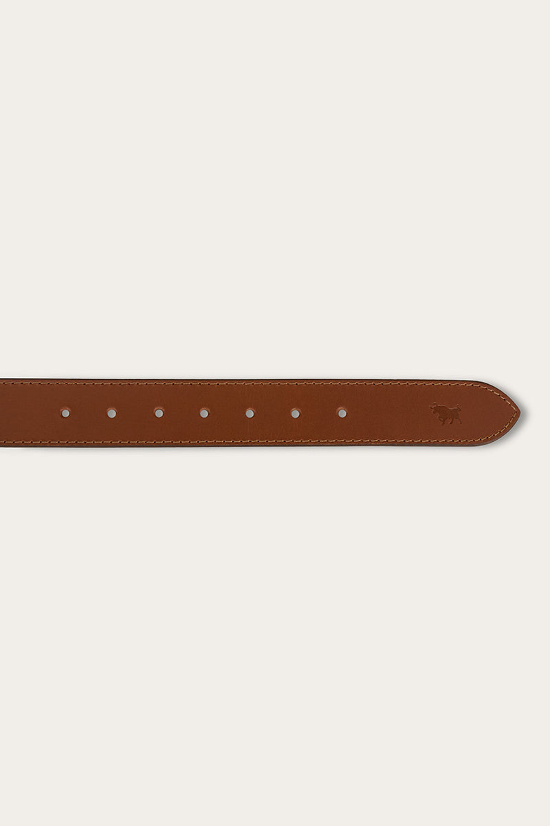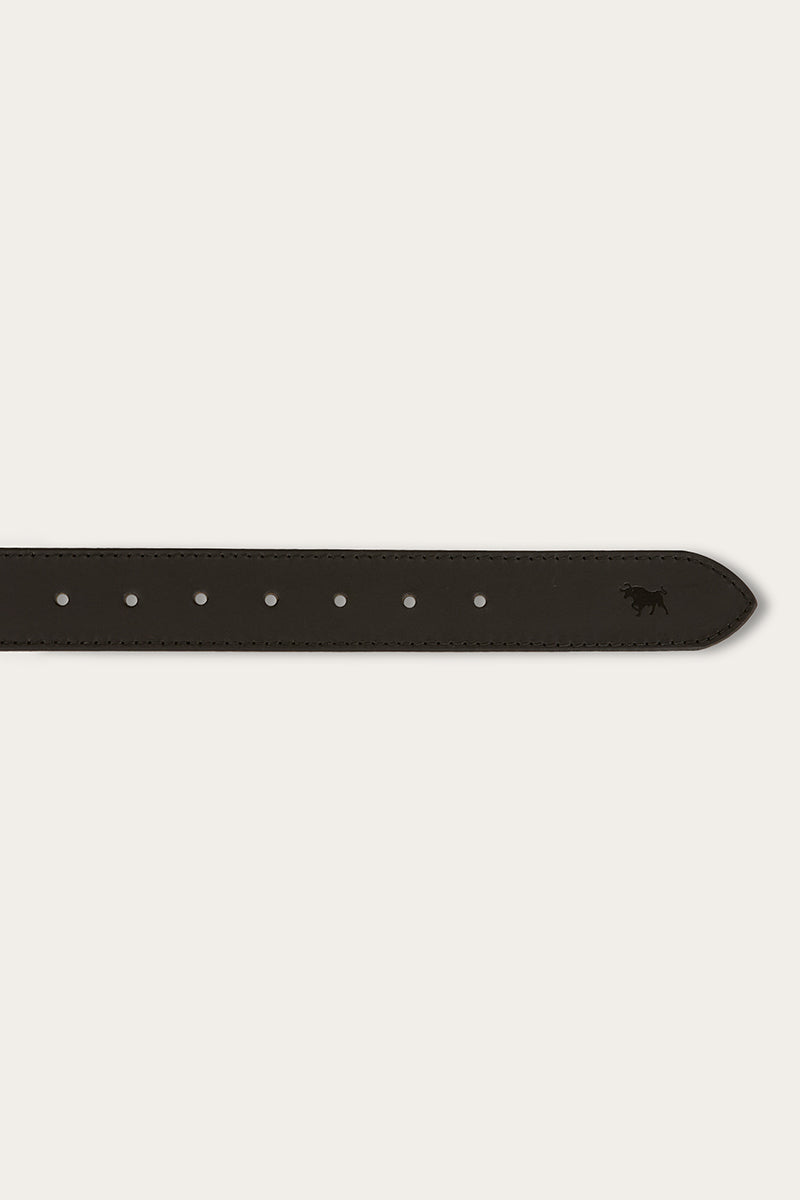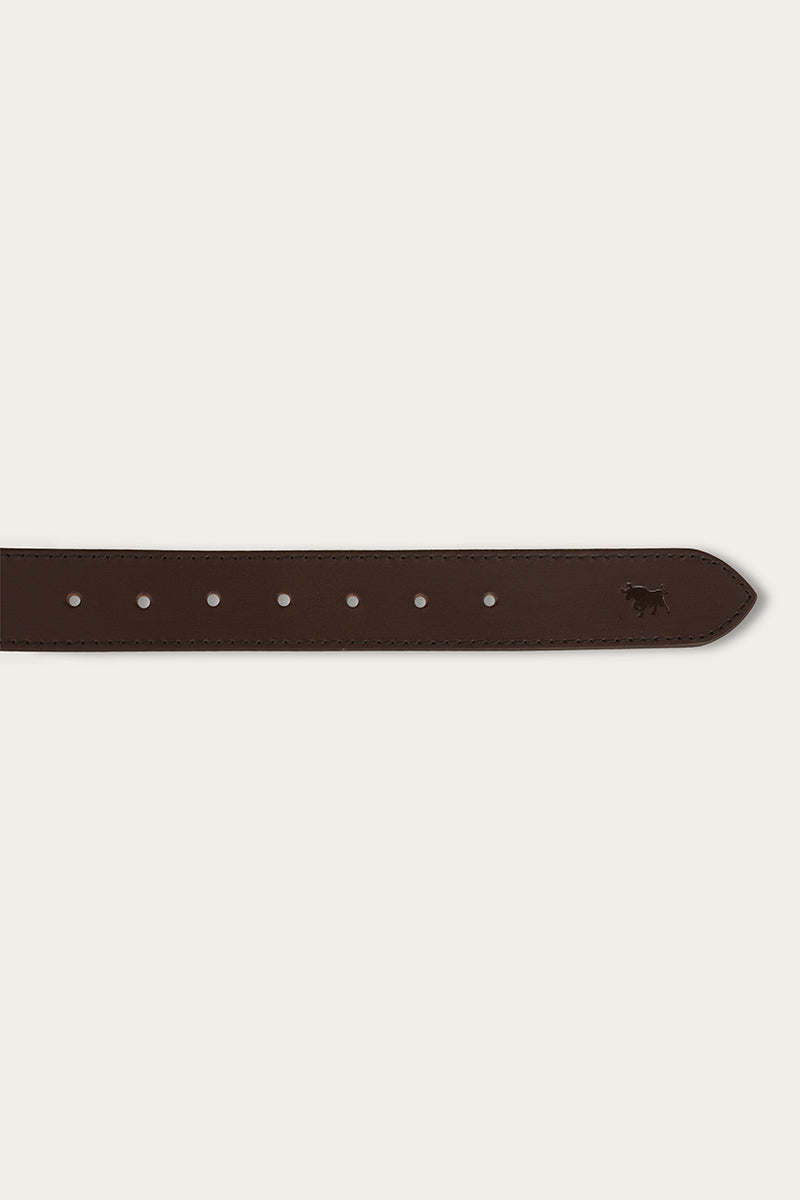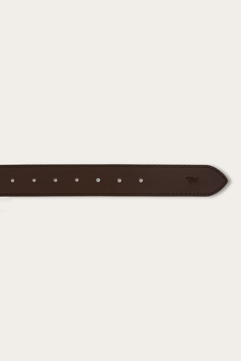 Crafted from 100% genuine leather, the James belt delivers rustic, timeless style and lasting durability. The premium leather design features a brass metal buckle and intricately engraved Ringers Western keepers.