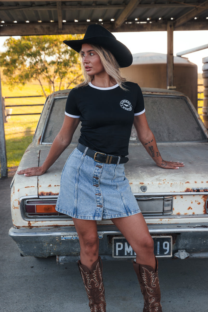 Created from 100% cotton, this rigid denim style offers more structure than stretch denim, whilst still providing the comfort and breathability that cotton is loved for. The A-line fit sits neatly on the waist line for a fit that is both flattering and comfortable. Front and back panel seams are stand out features, elevated with western back pocket stitching - both features a reflection of the wild west. A full front button placket opening allows for easy wearing whilst standard belt loops are both functional and fashionable. Style the Johanna with your favourite Ringers belt and tee for a classic fit you can count on.