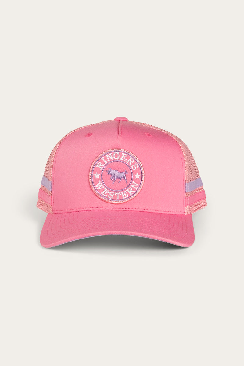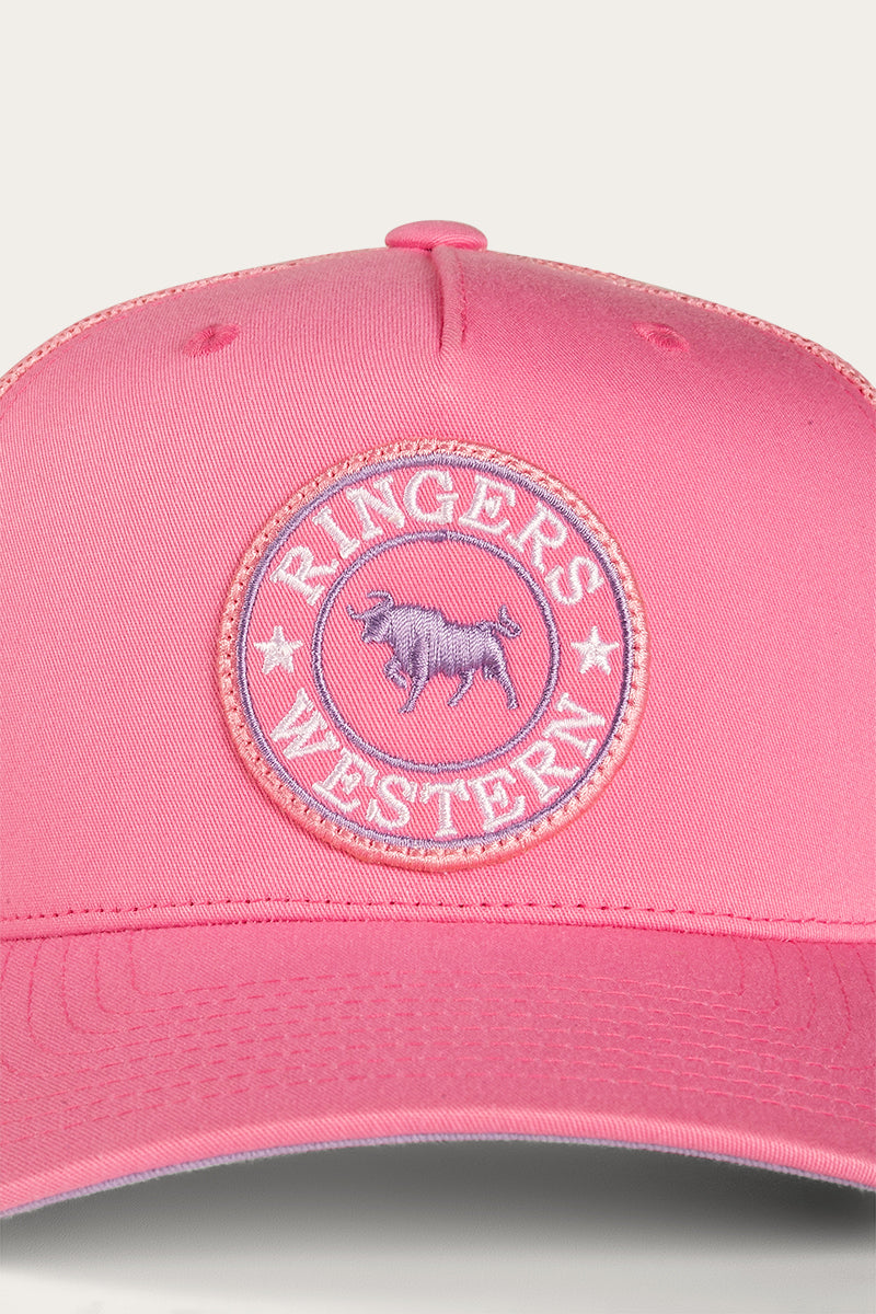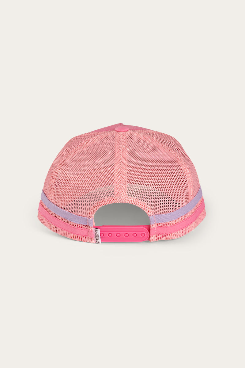 The Kids McCoy Trucker cap features an embroidered logo patch. This hat has our classic trucker cap shape, black mesh back panels and a black snap closure. The McCoy also features a contrast colour under the brim.