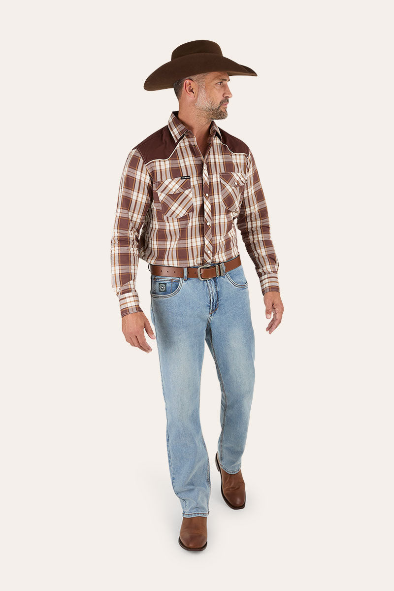 The Muster Mens Slim Straight Fit Jeans are the perfect choice for a day out horseback mustering or even better, heading into town for the local rodeo. These men's jeans have our Ringers mid-rise fit, which sits comfortably between the high-waist and low-rise point, designed to rest around the mid-section of the waist and just below the belly button.