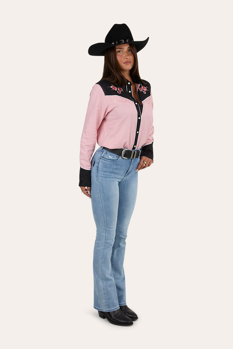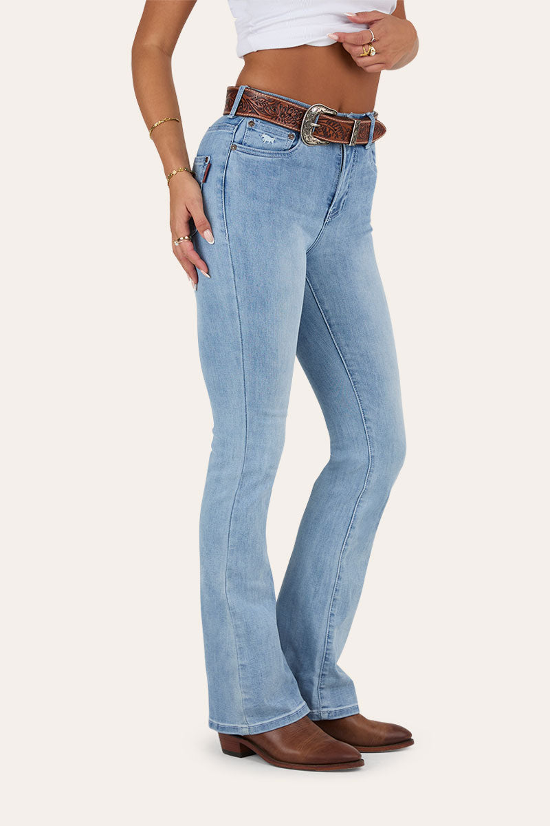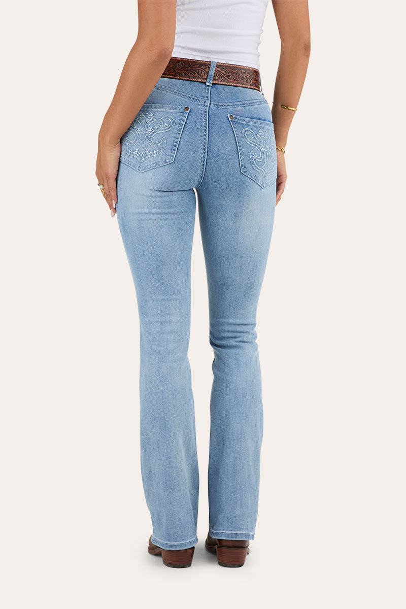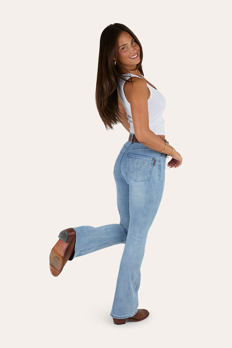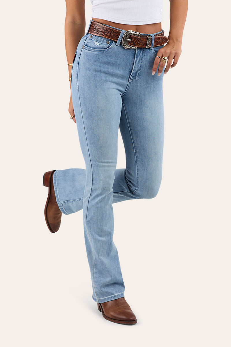The Penny Women's High-Rise Bootleg Jeans are a high-rise favourite, and they’re about to become yours too! Designed to sit comfortably above the belly button, these Ringers Western jeans offer a snug fit from the waist through the hips and thighs, naturally contouring a woman’s curves. They hug the thighs and taper down to the knee, where our signature bootleg shape begins its subtle flare.