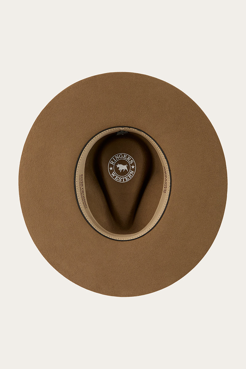The Rivercrossing Hat is a standout amongst the Ringers Western hat range - a premium choice for anyone seeking Australian western hats crafted with style and durability. Proudly constructed from premium 100% Australian Merino Wool, this elegant hat has been designed to withstand the toughest of conditions.