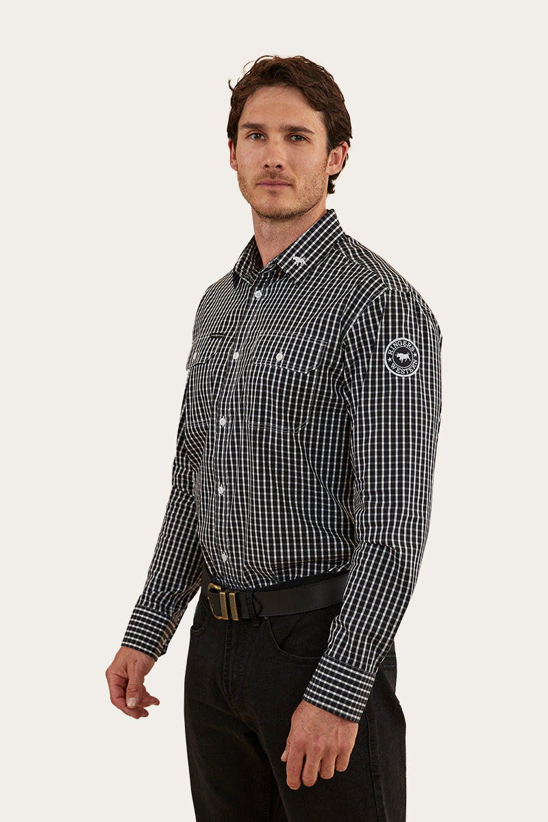 Shelton is the perfect PBR number. This semi-fitting dress shirt is the perfect blend of tradition and modern western wear. Our Ringers Western semi-fit dress shirts closely follow the natural shape of your body without feeling too snug or restrictive. Crafted from a premium blend of cotton, nylon, and a hint of spandex, this shirt offers a luxurious feel with a touch of stretch for unmatched comfort and mobility. The Shelton features multiple embroidered logos on the collar, wearers left arm and centre back yoke while the double chest pockets add both style and utility to your outfit. This dress shirt has our 'Cowboy' length which ensures you will never be left untucked - a tried and true staple.
