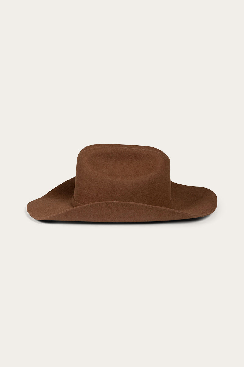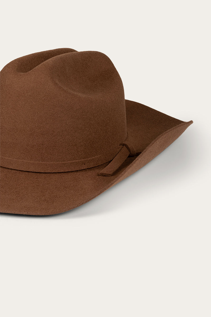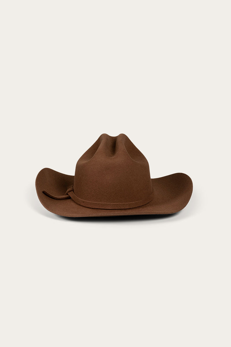 Introducing the Tasman Kids Felt Hat, crafted from premium wool felt and designed especially for young cowboys and cowgirls. This kids cowboy hat offers both durability and style, featuring an internal faux leather sweatband for added comfort and a classic self-felt hat band. Inside, the hat boasts a Ringers Western crown patch with stamping, giving it a touch of authentic branding.