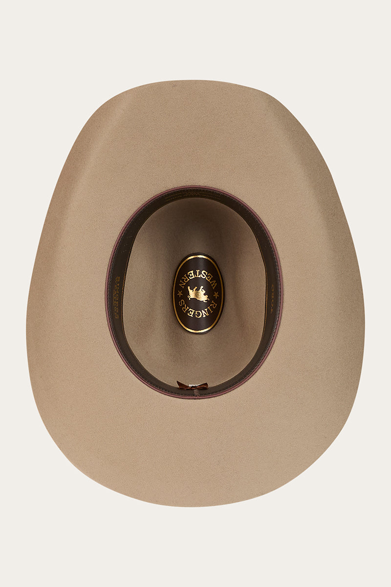 The rounded cattleman crown offers a snug, secure fit that stays in place, even when facing the wind at full gallop. A distinctive squared front brim adds a sharp edge to the silhouette, giving the Toro its unmistakable Western character.