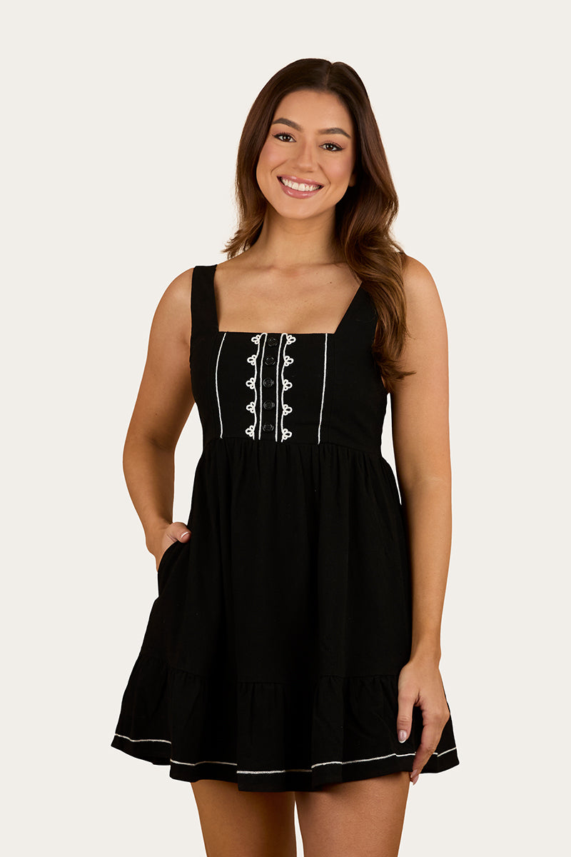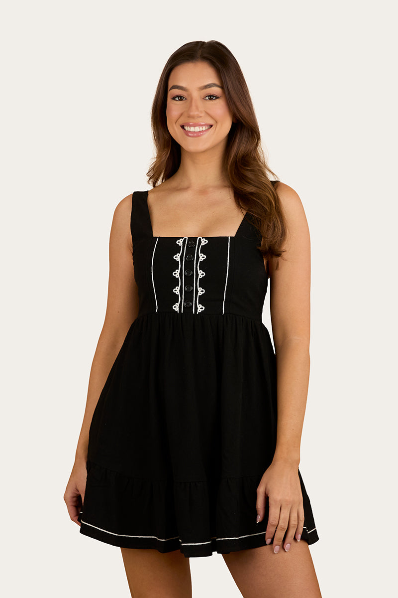 Created from a premium cotton and linen blend, the Westley dress will keep you cool and comfortable on the warmest of days. This playful mini features a shirred back panel and adjustable shoulder straps, both details allowing for a secure and customisable fit. The combination of the mini length and frill hemline add a fun and playful feel to this delightful dress, perfect for casual summer days spent chilling with friends. Feature applique embroidery provides just enough country charm to make the Westley every country girls favourite black mini.